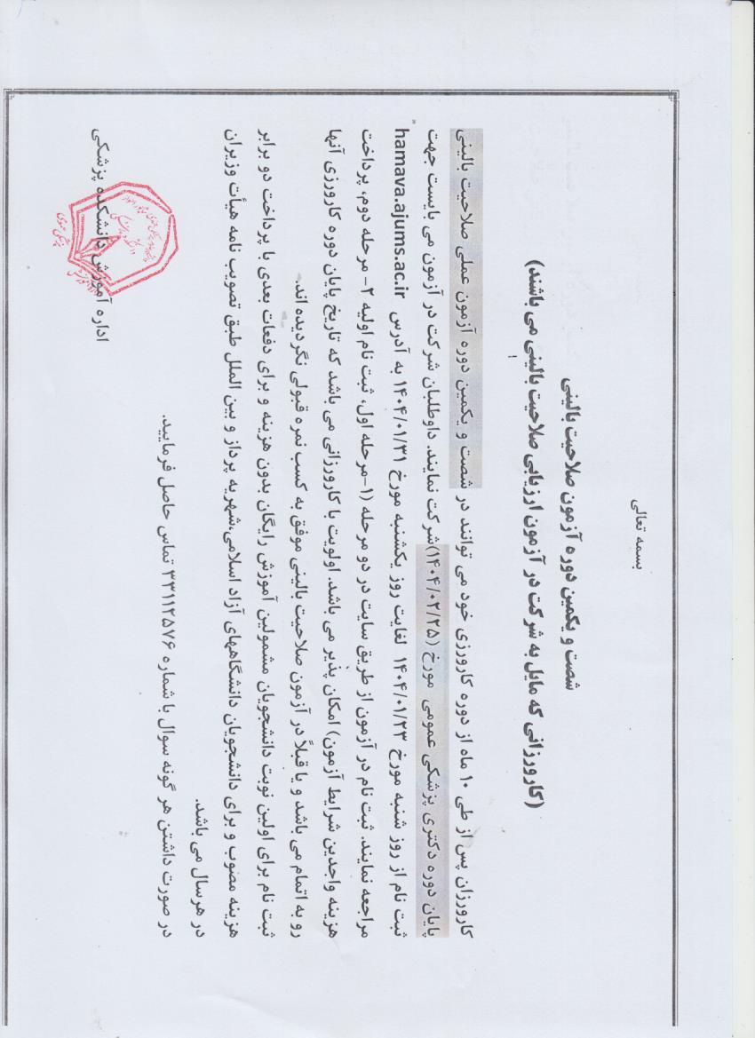 اطلاعیه برگزاری شصت و یکمین آزمون صلاحیت بالینی پایان دوره پزشکی مورخ 1404/02/25 اطلاعیه برگزاری شصت و یکمین آزمون صلاحیت بالینی پایان دوره پزشکی مورخ 1404/02/25
