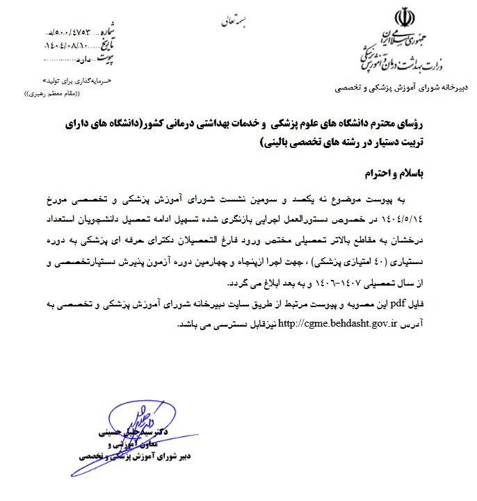 دستورالعمل اجرایی بازنگری ادامه تحصیل دانشجویان استعداد درخشان به مقاطع بالاتر مختص ورود فارغ التحصیلان دکترای حرفه ای پزشکی به دوره دستیاری (40 امتیازی پزشکی) دانشگاه های دارای تربیت دستیار